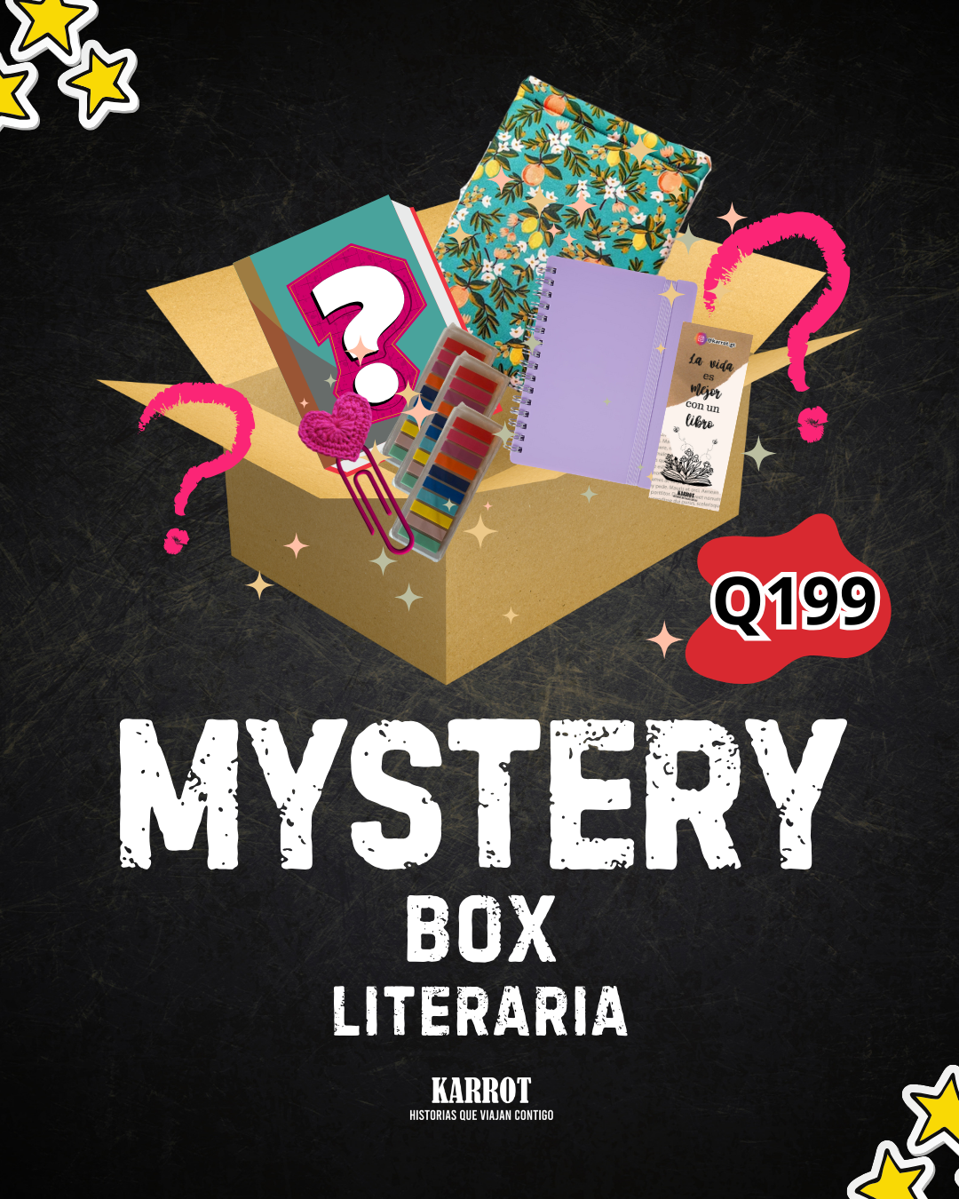 Si amas los libros y las sorpresas, esta caja es perfecta para ti. Con nuestra Mystery Box Literaria, recibirás una selección especial de artículos diseñados para hacer de tu experiencia de lectura algo aún más mágico.