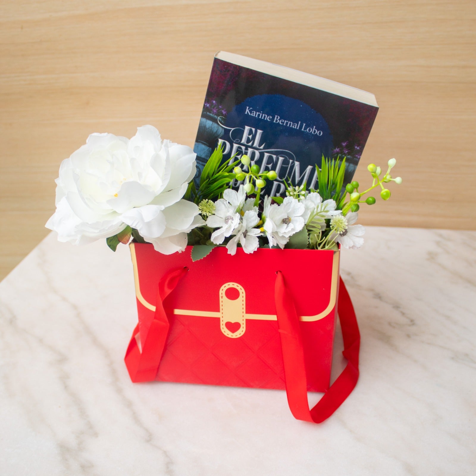 Nota: El libro de la foto no está incluido, pero puedes elegir el que quieras y convertirlo en el complemento perfecto para este hermoso ramo por un monto extra, que es el precio del libro que desees agregar.