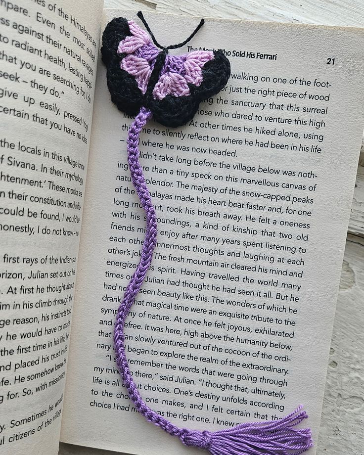 Un separador artesanal de crochet. Un separador elegante con forma de mariposa que evoca la libertad y la belleza natural. Ideal para libros de poesía o romance.